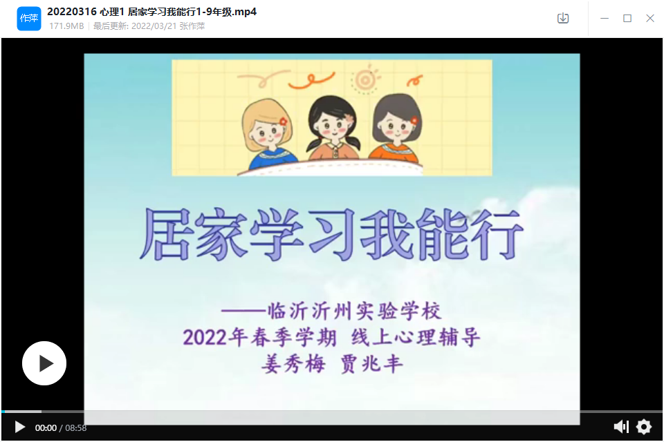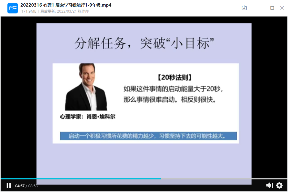 居家學(xué)習(xí)和在校學(xué)習(xí)有很多不同,學(xué)生也會(huì)面臨一些新的挑戰(zhàn),比如網(wǎng)絡(luò)不順暢,聽課不清晰;作業(yè)拍照上傳光線不合適等等,會(huì)讓家長和孩子產(chǎn)生焦慮情緒,那如何調(diào)整做好居家學(xué)習(xí)呢?賈老師向同學(xué)們介紹了居家學(xué)習(xí)的小妙招,并通過生動(dòng)的朝三暮四小視頻故事,讓學(xué)生學(xué)會(huì)控制心中的“猴”。在策略方面,賈老師介紹了分解任務(wù),突破小目標(biāo)的20秒法則。同學(xué)們認(rèn)真學(xué)習(xí),掌握了一定的方法和策略。